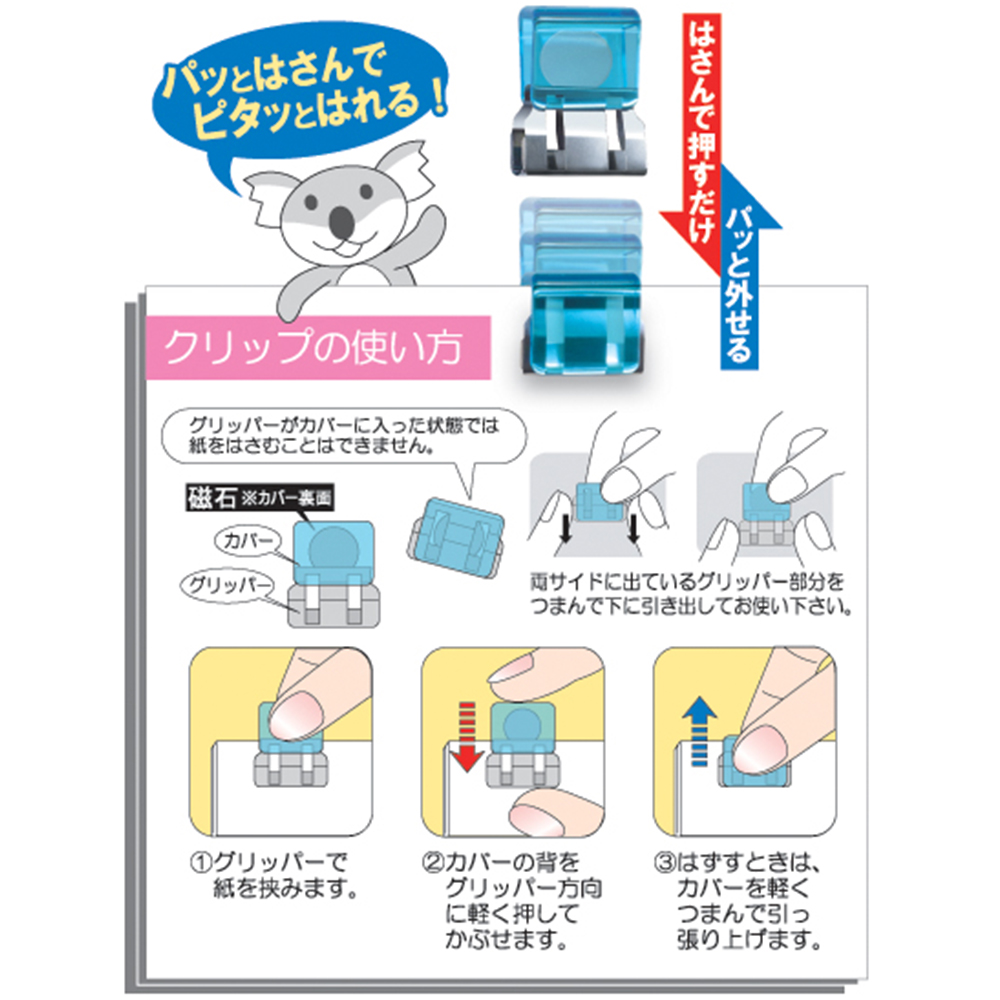 ★ 可夾10張一般用紙 ★ 背面磁鐵式滑滑夾,可以將文件資料吸附在白板上或磁性格板上 ★ 有四種顏色可以方便分類,也可將食譜吸附在冰箱上。 ★ 方便實用,不怕資料找不到 廠牌:TOHKIN 東京金屬 型號:SCC-LMG4M 規格:金屬滑滑夾磁鐵 材質:封面:聚碳酸酯、不銹鋼、磁鐵 尺寸:26 x 20 x 14 mm ※ 顏色會依螢幕不同產生色差,請以實物為準
